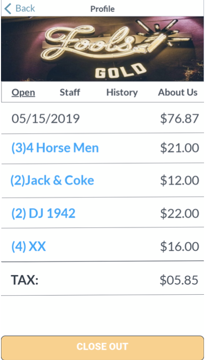 A mobile platform that allows patrons to close tabs from their phones, yield rewards, and rate servers.