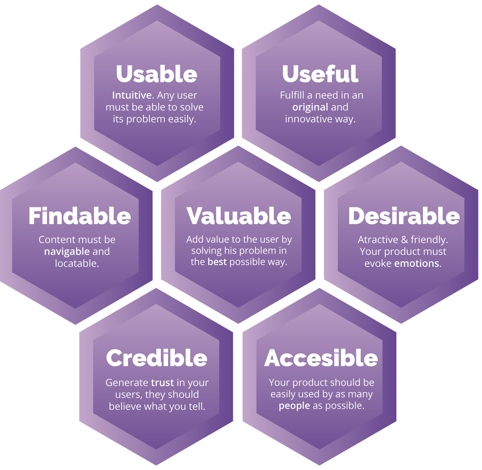 In the core of my product design philosophy lies the UX Honeycomb. In the center of the honeycomb is Value, because no matter what industry you're in, the goal is to bring Value to your users.
